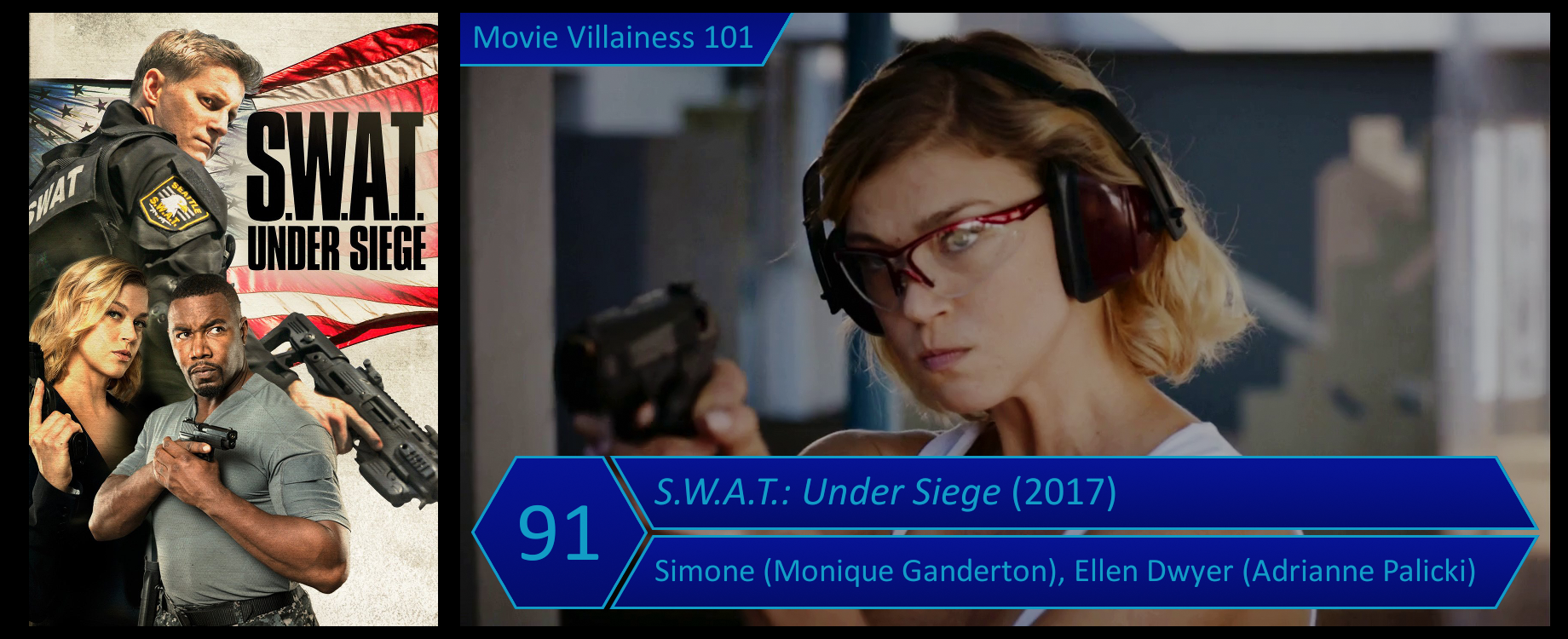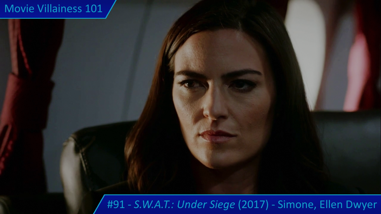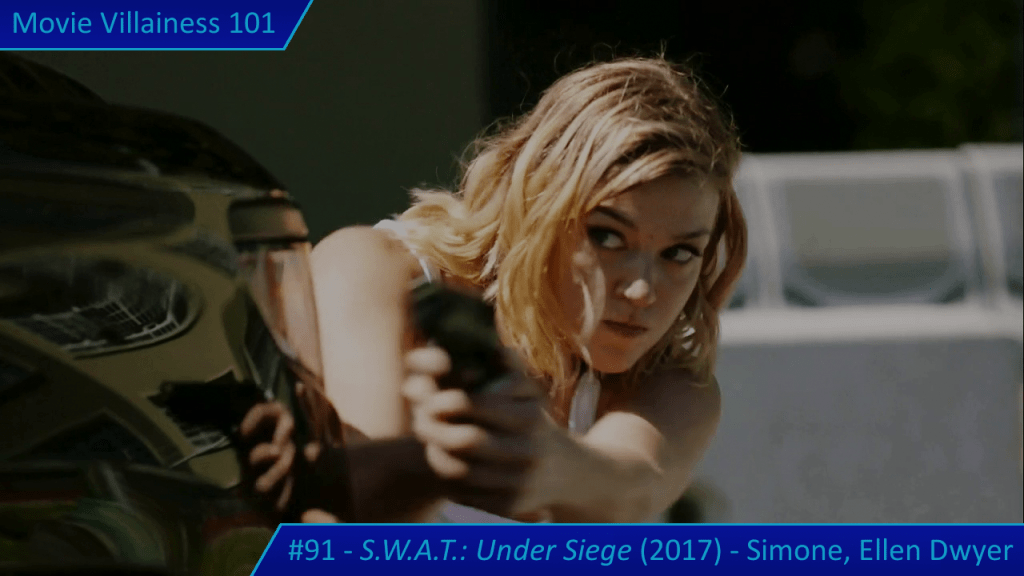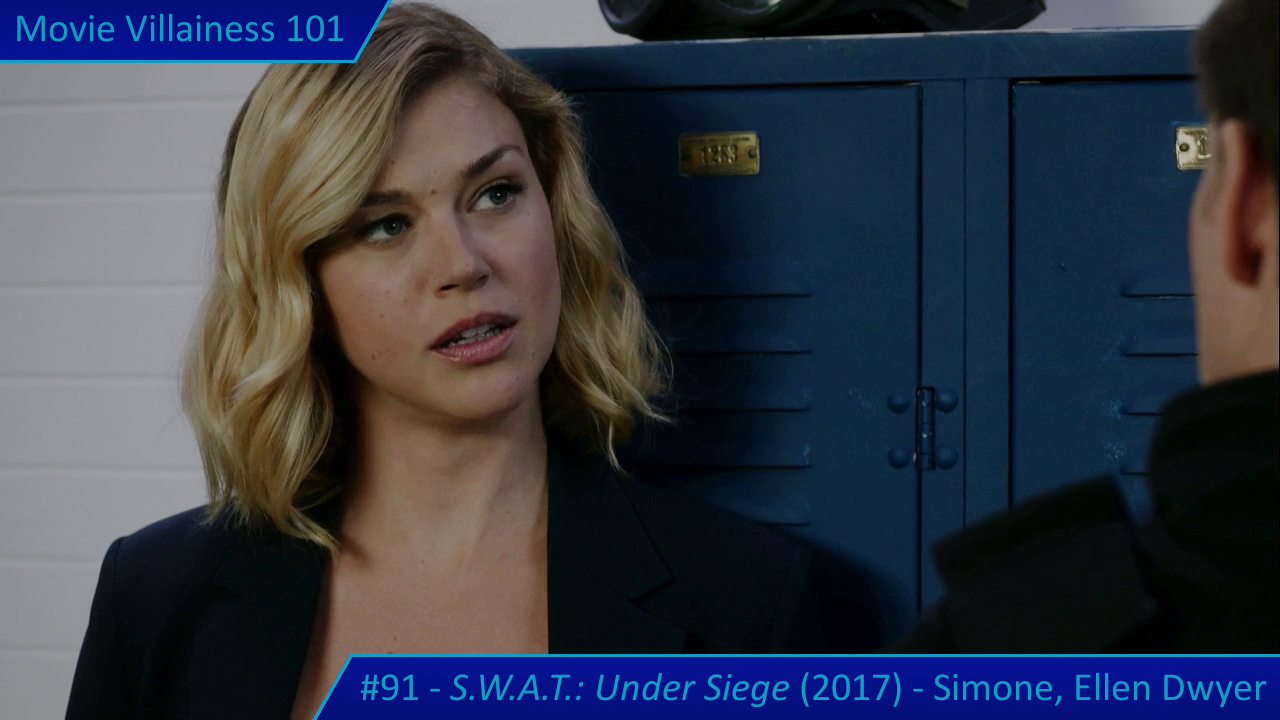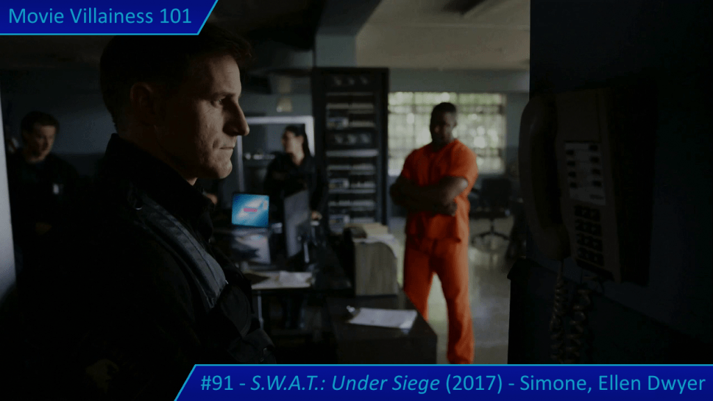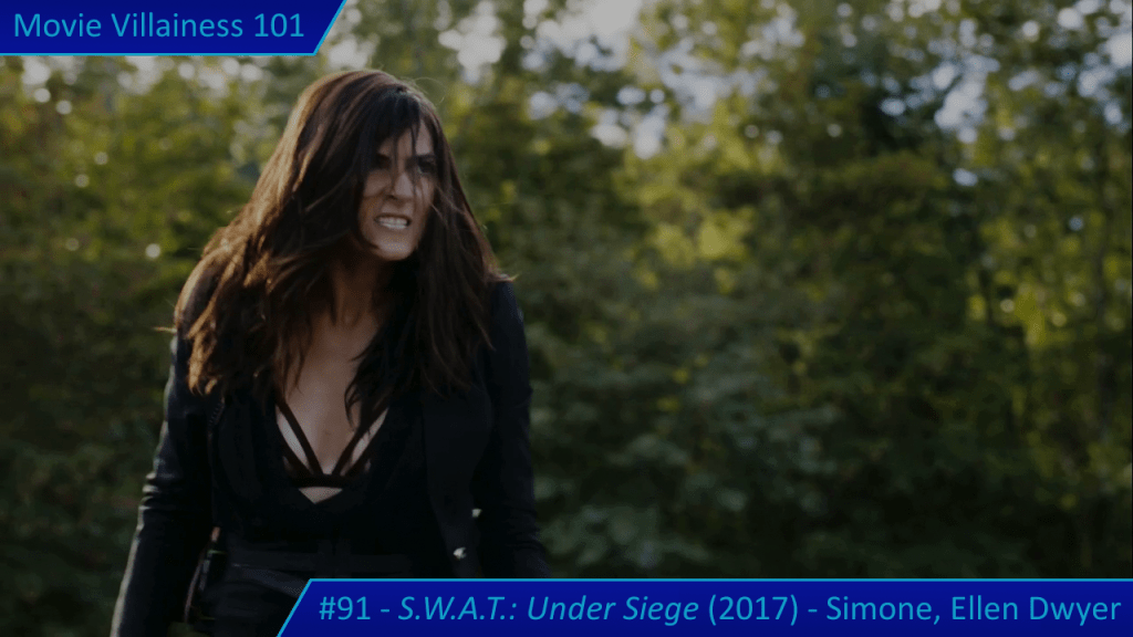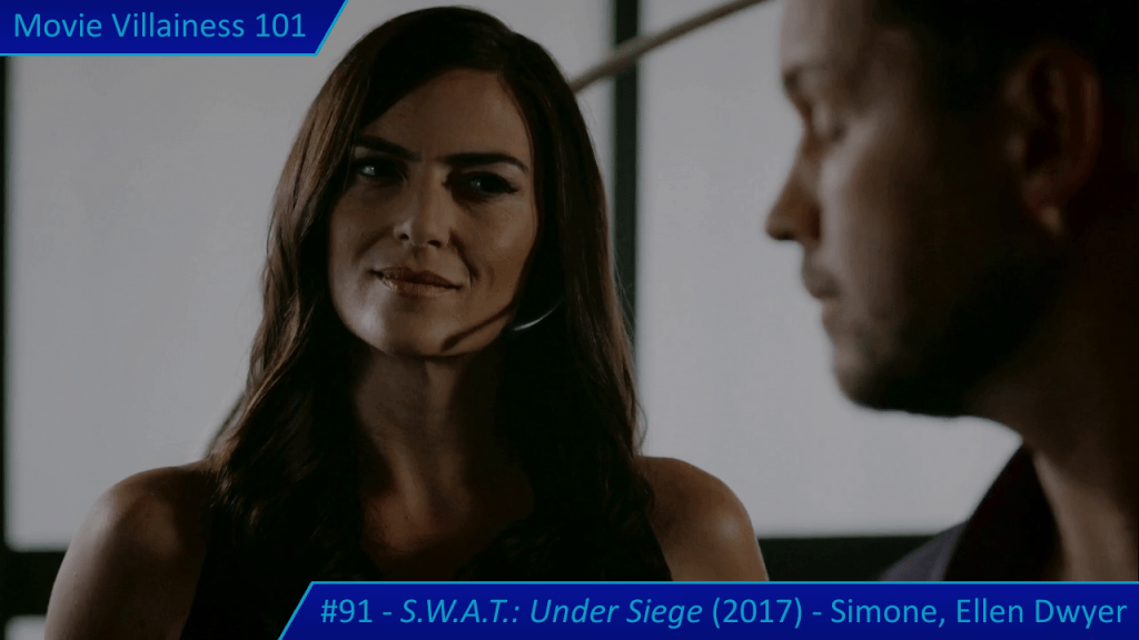 A male hacker gets too distracted by the beautiful henchwoman (with her semi-revealing black leather top, who can blame him?), and Simone quickly establishes her authority by rubbing his shoulders. Sounds sexy, but her toying behaviour makes him uncomfortable. Simone’s best non-action moment comes when she threatens their S.W.A.T. team’s families unless they surrender Scorpion. Her evil smirk afterwards is pure gold.