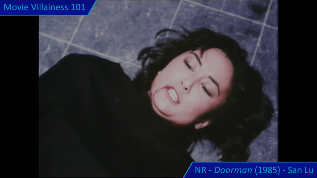 Movies where the hero literally unmasks a villainess are rare, which earns this otherwise pedestrian thriller an honourable mention. A black-gloved killer prowls an apartment building, offing doormen so quickly that three are dead within twenty minutes. The murderer is a martial arts expert with a death touch technique, somehow able to snap a man’s neck with one hand. Kill scenes are laughably inept, bloodless even by TV movie standards.