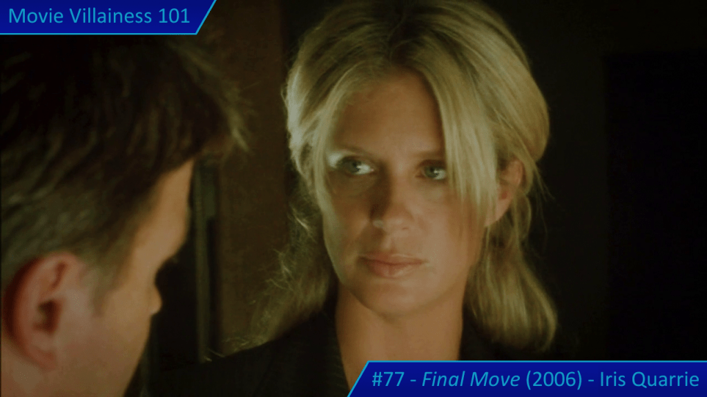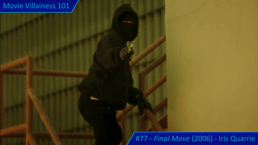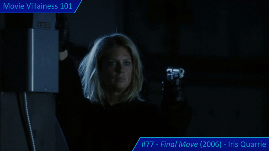 In the climax, the masked killer lures the men to a warehouse. She shoots Krieg and confronts Marlowe, with his kidnapped wife and daughter strapped to an explosive-rigged chair. When the black-clad Iris removes her balaclava, it’s no surprise she’s the copycat chess killer, but good to have an actual reveal.