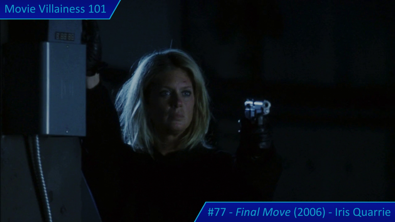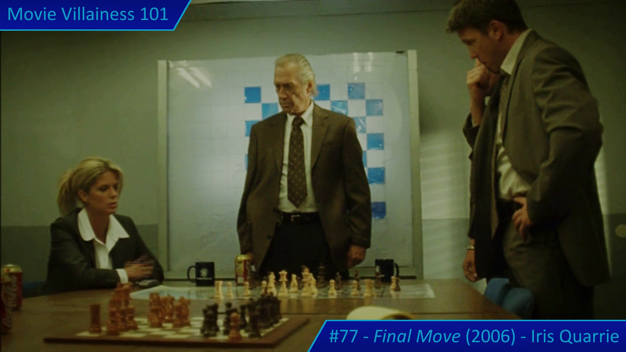 In the climax, the masked killer lures the men to a warehouse. She shoots Krieg and confronts Marlowe, with his kidnapped wife and daughter strapped to an explosive-rigged chair. When the black-clad Iris removes her balaclava, it’s no surprise she’s the copycat chess killer, but good to have an actual reveal.