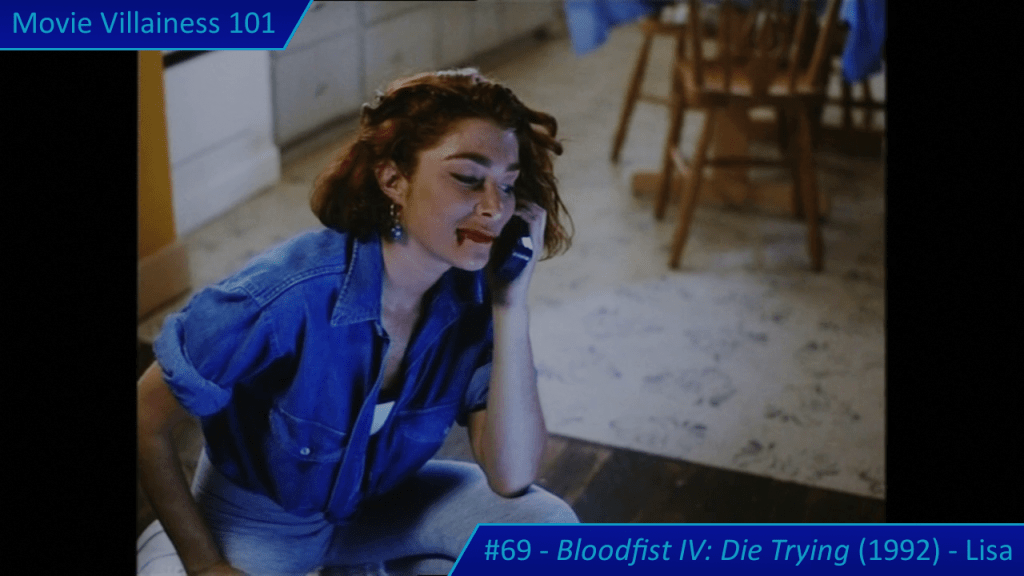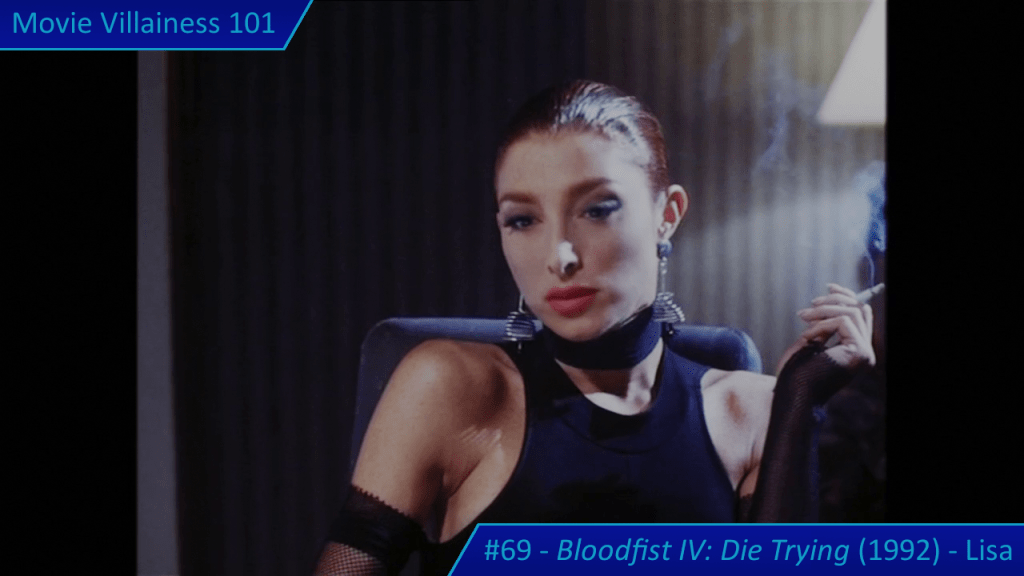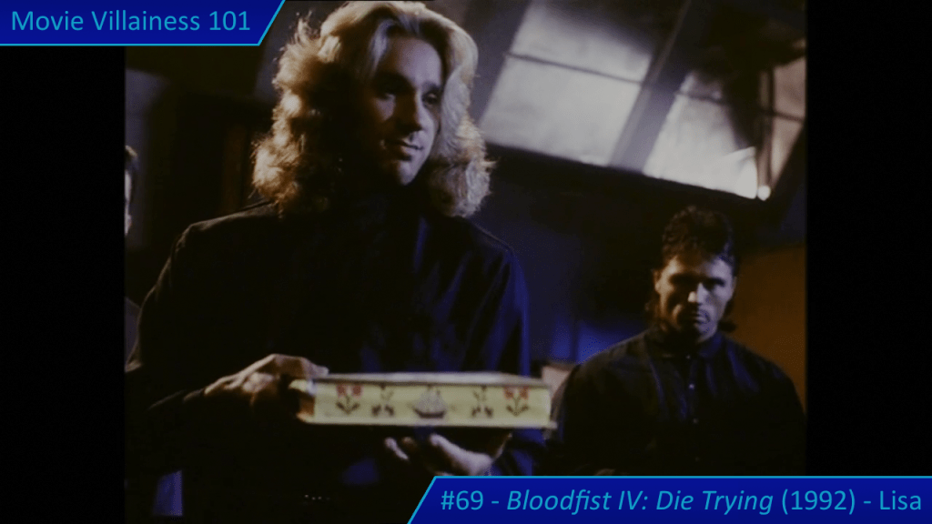 When Lisa returns, she’s dressed in a suitably evil black outfit and smokes a cigarette. Cat Sassoon comes across as menacing, so it’s unfortunate the actress died at a young age. Lisa shows her ruthlessness after two henchmen recover the wrong box of chocolates. Instead of her fists, the villainess uses a switchblade to cut the throats of the lackeys with one swipe.
