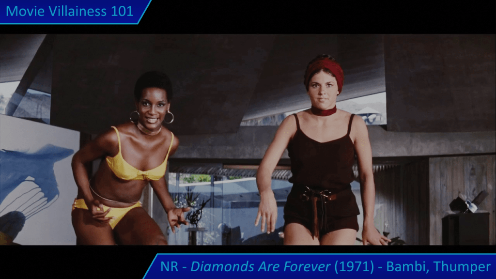 For villainess fans, two physical bodyguards in Bambi and Thumper, and like everything else in this movie, their scenes ooze camp. This is Bond’s first proper fight with female opponents, but the ending is weak. The two women dunk Bond in their swimming pool, only to be easily overpowered moments later.