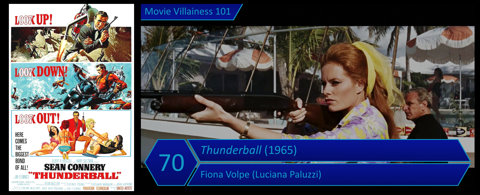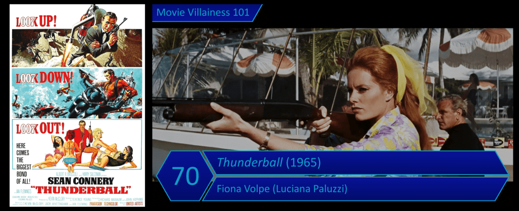 The main female character is Pussy Galore, the villain’s personal pilot. A damn good one (in her words) and a judo expert. Bond still overpowers the feisty woman, seduces her, and converts her to the cause of good. So she exchanges the deadly nerve gas for a harmless alternative, and Goldfinger – while a classic movie – is not the best from a villainess perspective.