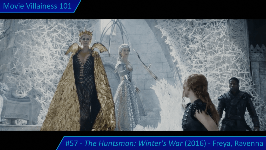 Freya is the main villain for acts one and two, and the prequel section does a good job of establishing her character. This lady is literally an ice queen, whose magic powers awaken after her child is murdered. The person responsible is seemingly her lover, but most viewers will deduce early on that Ravenna is behind it. Especially since she lurks in the corridor beforehand, but the proxy killer is enough to deceive her naïve sister.