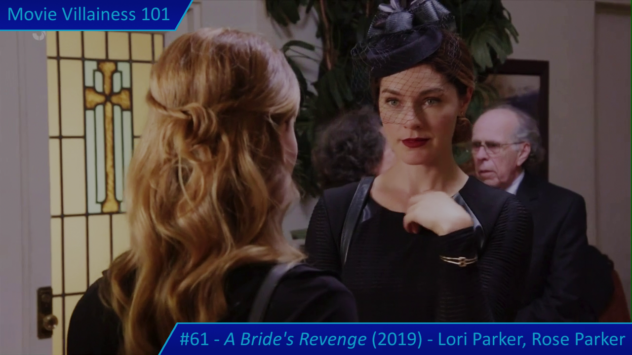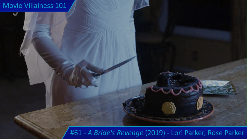 There’s no doubt who the main villain is, with Lori acting completely psycho from her first scene. She does all the crazy woman stuff required: taunting the heroine, loony-eyed stares, self-harm, and threatening her boyfriend just because. Lori somehow convinces the police Miya is insane thanks to a doppelgänger bride / accomplice. The outfit is an original take and contributes to the eerie stalking sequences. Nothing like a woman in long white gloves and a trailing dress sticking a knife into a wedding cake. Before she offs her victim, in this case Ian’s mother.
