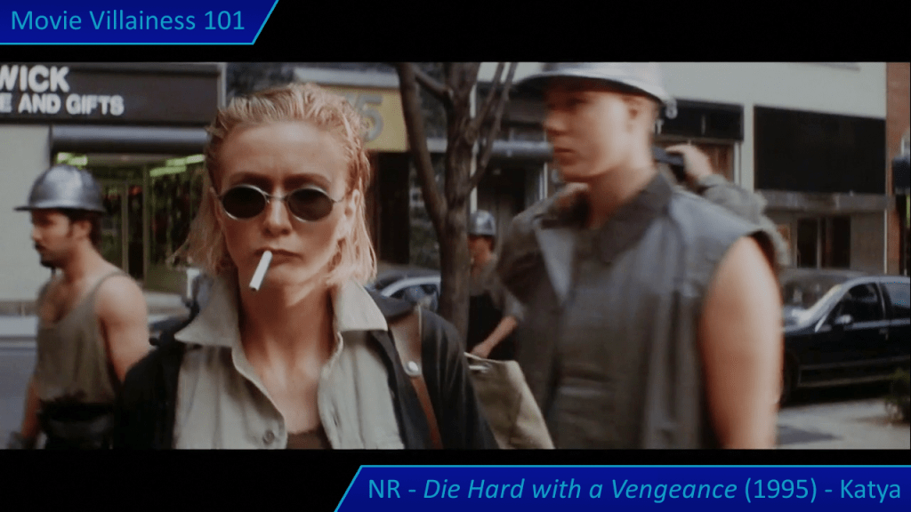 Like almost all Die Hard villain plots, this is ultimately about a heist. In this case, the theft of gold bullion from the Federal Reserve Bank. The mute villainess Katya gets a brutal introduction when she drills her way into the vault and slices up a guard. After that, she mostly stays in the background until the climax. It turns out she’s the lover of the tough henchman and in a secret relationship with Simon. Guess she likes the main baddie more, since she murders his competition during a double-cross.