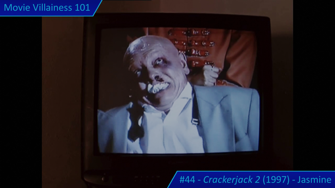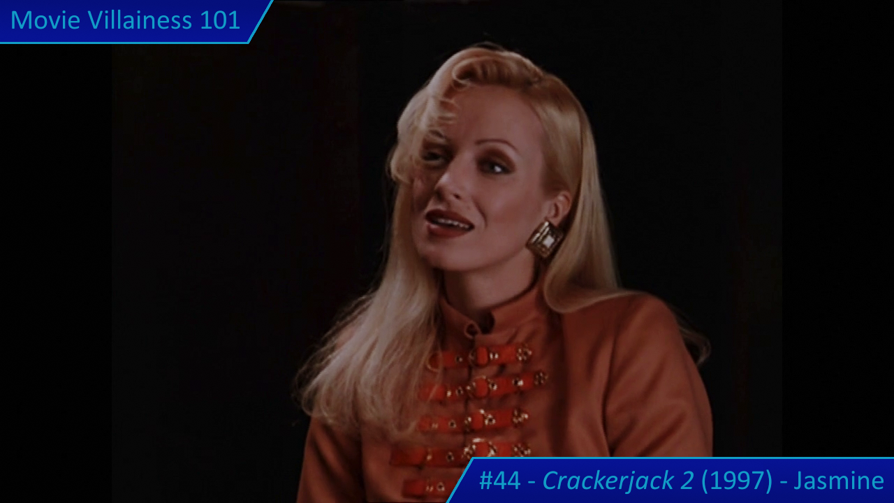 The prologue is the expected loud action sequence that introduces the feud between Wild and Becker, and also an incompetent boss who arrests the hero for obstruction of justice. Jasmine is absent for this, but shows up for the aftermath at the villain’s hideout. The villainess claims a captured businessman was “no fun” moments before she garrotes him live on camera. The kill happens off screen, but this is already an improvement on the first Crackerjack film.
