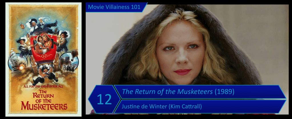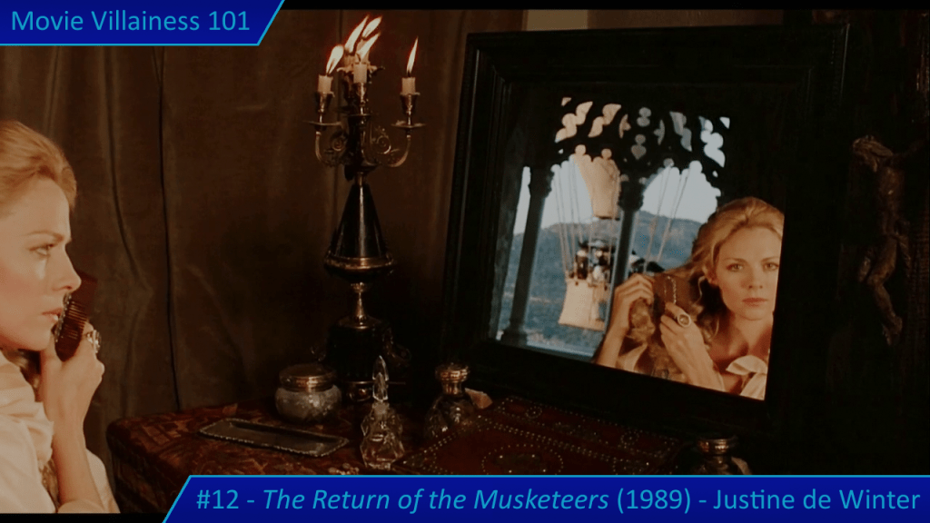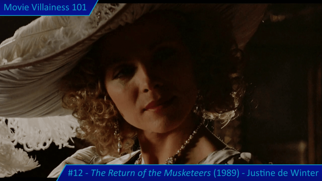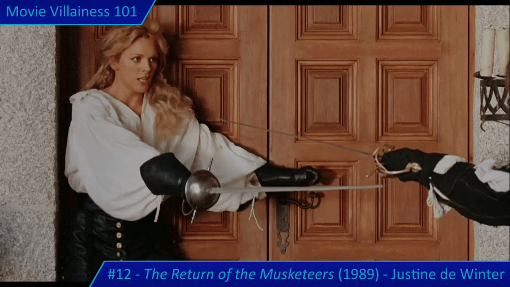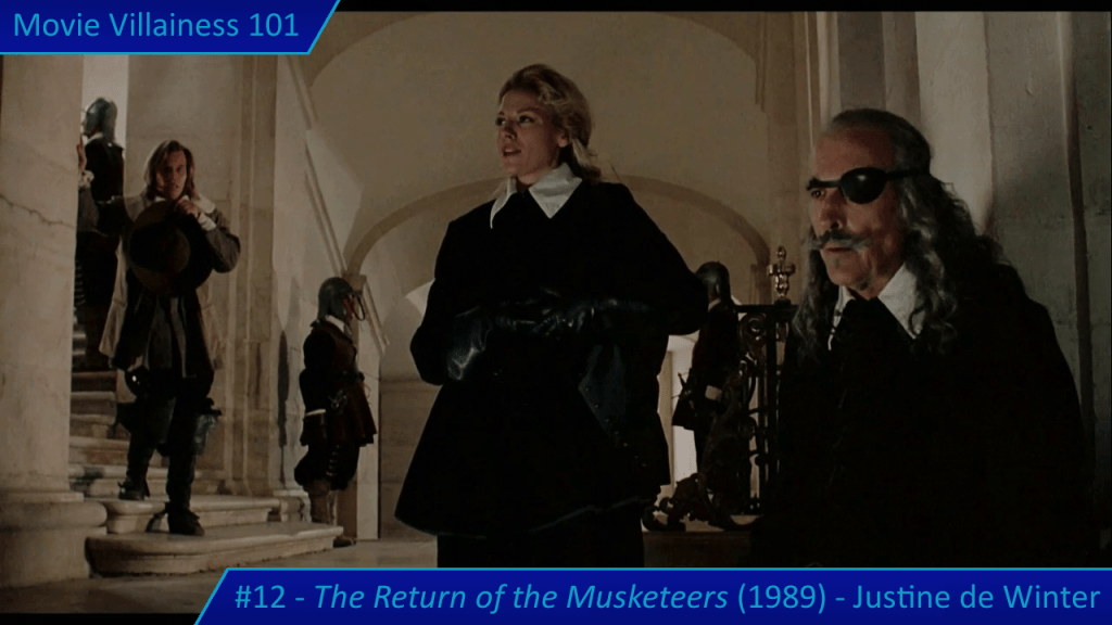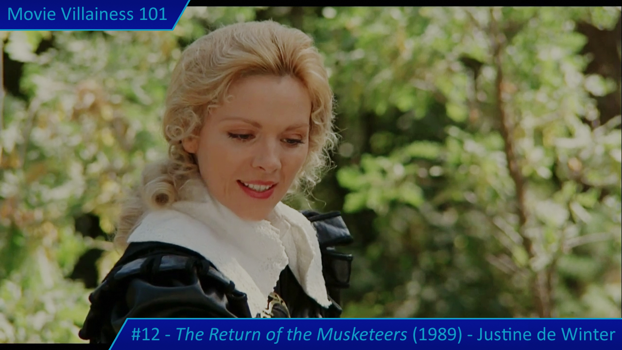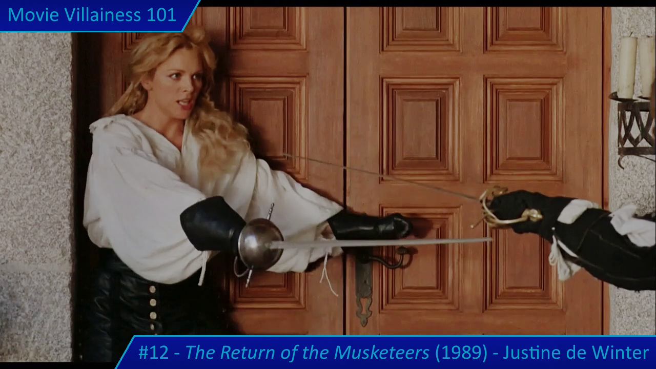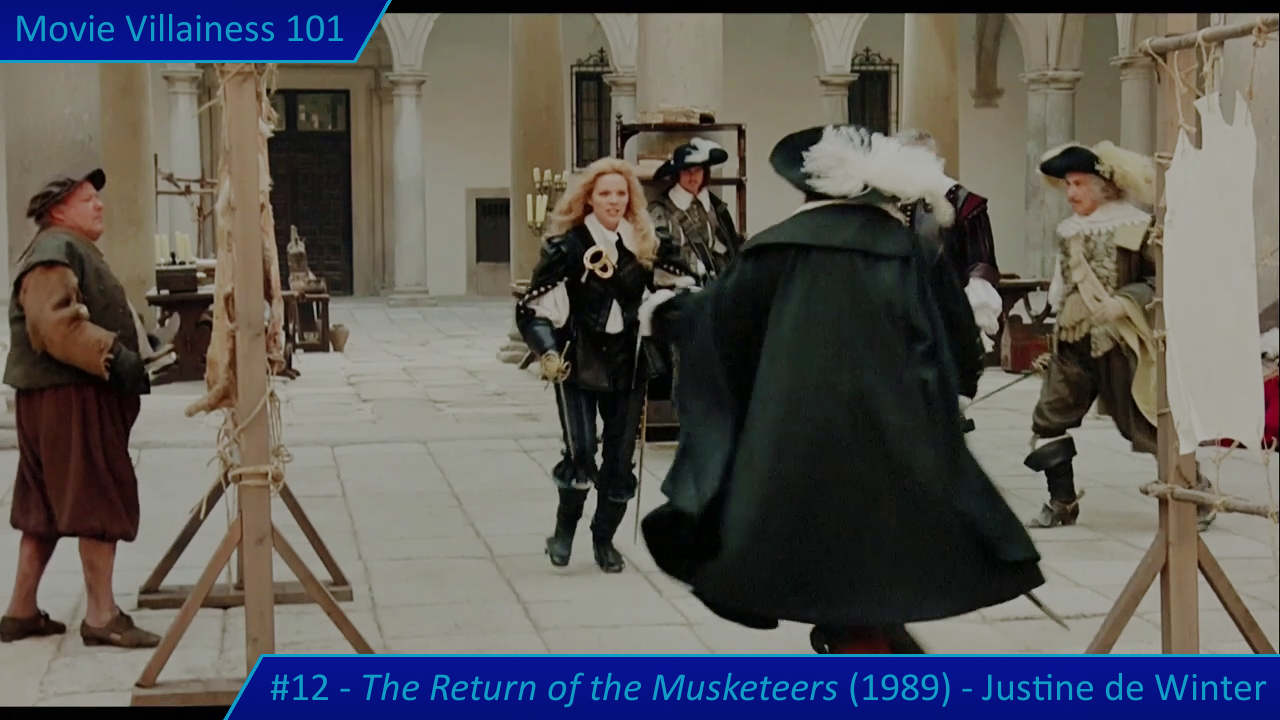 Justine de Winter is the daughter of Milady and Rochefort, and their offspring is a mistress of deception, complemented by her expertise in swordplay. Add two unmasking scenes and many encounters with her victorious, and the result is a legendary villainess.