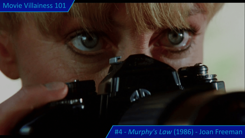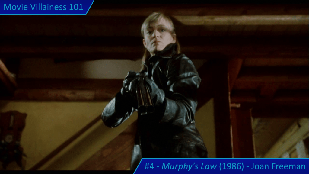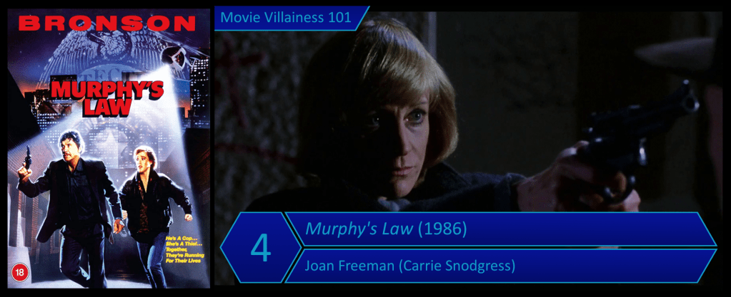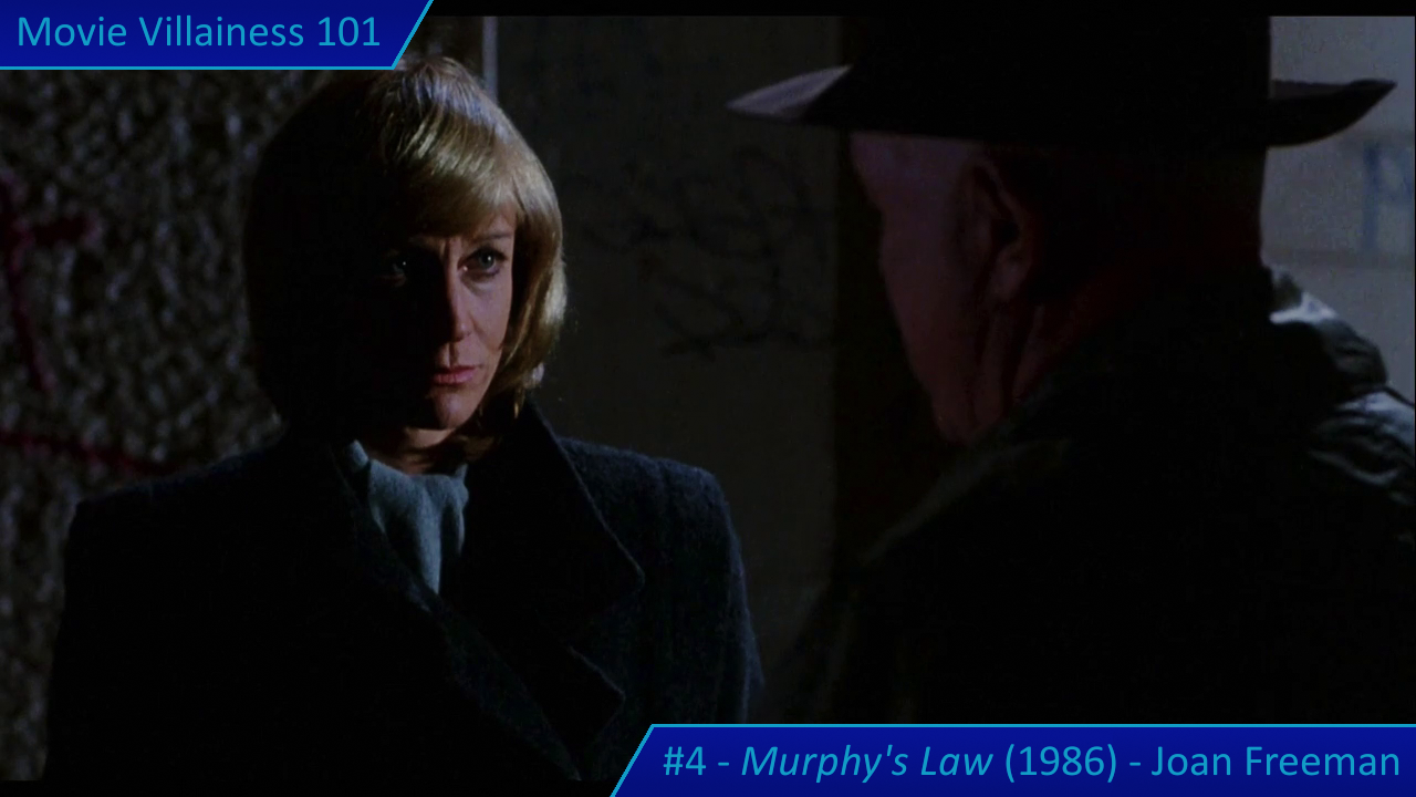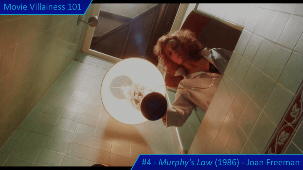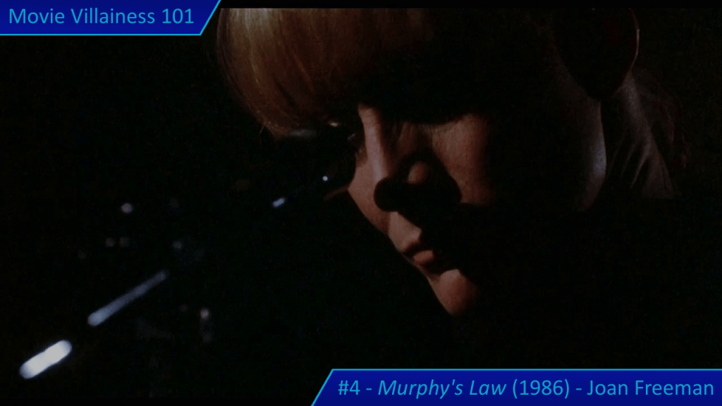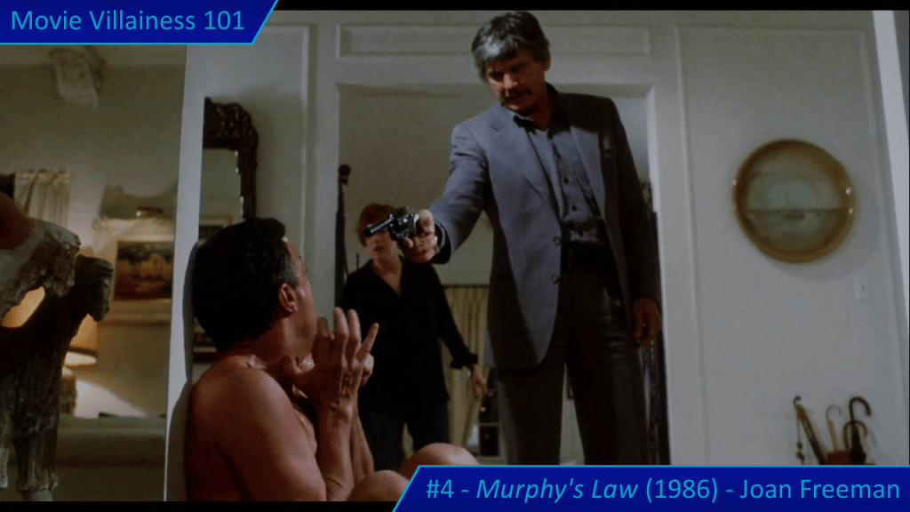 Things are about to get even worse when Joan Freeman arrives in town. The paroled murderess meets with a private investigator to get information on her targets: various men in the police force and legal system who put her away. Joan shows how psychotic she is when the PI negotiates for more money. Perhaps he shouldn’t have followed her from the public park to a secluded underpass. The villainess points a gun at the man, demands he open his mouth wide, and blows his brains out. Face covered in blood, Joan is a terrifying killer about to screw with Jack Murphy’s life.