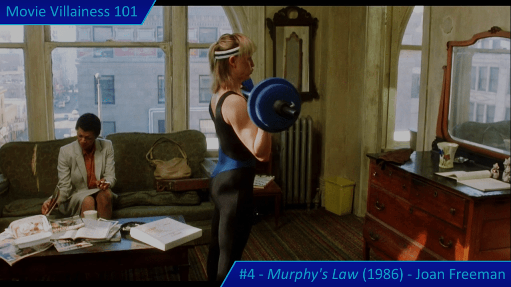 Kathleen Wilhoite makes her feature debut as Arabella McGee, a punk with a loud mouth and a creative vocabulary. Every other word she utters is an insult, which adds humour amidst the violence. Arabella makes the mistake of stealing Murphy’s car during the title credits, but he soon catches up to her after some wild driving and a spectacular crash. The female thief is much better at kneeing a guy in the balls and escaping. Murphy is better prepared for a later encounter in a women’s restroom, leading to a tirade of expletives as he restrains her.