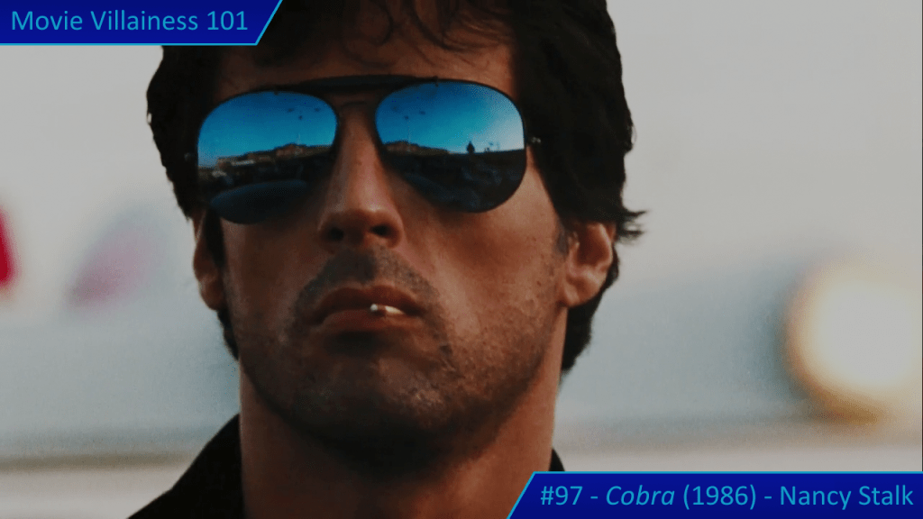 Lt. Cobretti (Sylvester Stallone) is the typical action hero: a cowboy cop who drives a classy car, wears cool shades, and chews matchsticks while dealing out lethal justice to criminals. “Cobra” is the man superiors call when they need tricky situations dealt with. Naturally, the same bureaucratic bosses then blame the hero for being reckless.