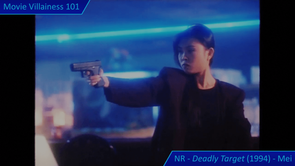 There’s a minor henchwoman in the opening scene, but she’s considered expendable by the main villain and dies within the first ten minutes. Mei is a more important criminal enforcer who murders rival gang members and anyone else who gets in her way. The villainess has some memorable scenes, notably a murderous, gun-toting rampage at a charity fundraiser. One guy takes cover behind an overturned table, but that offers no protection against Mei’s armour-piercing rounds.