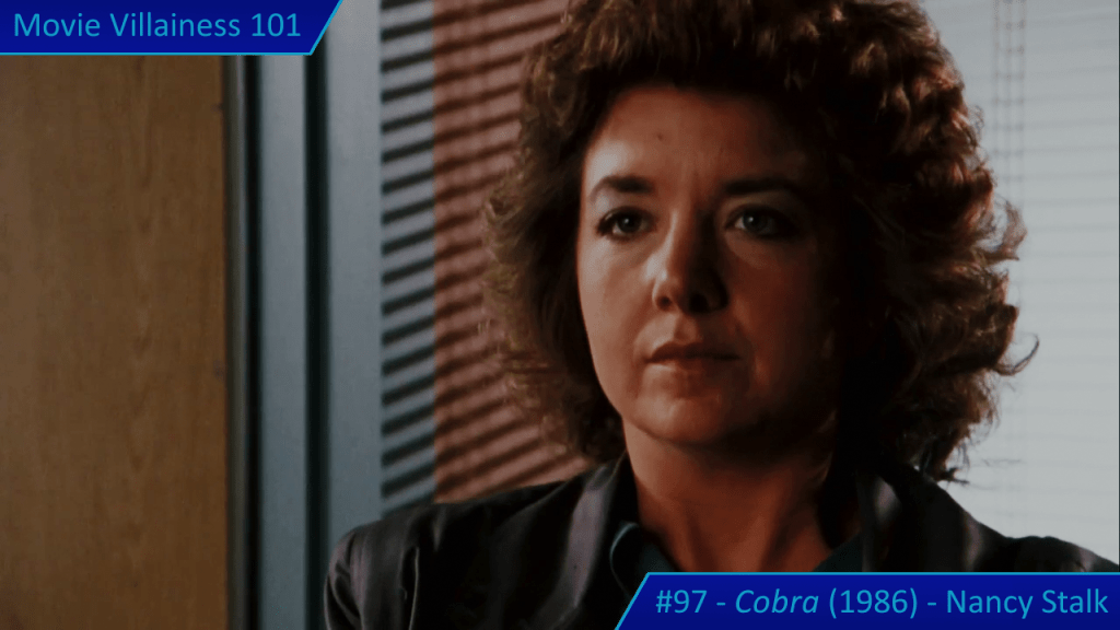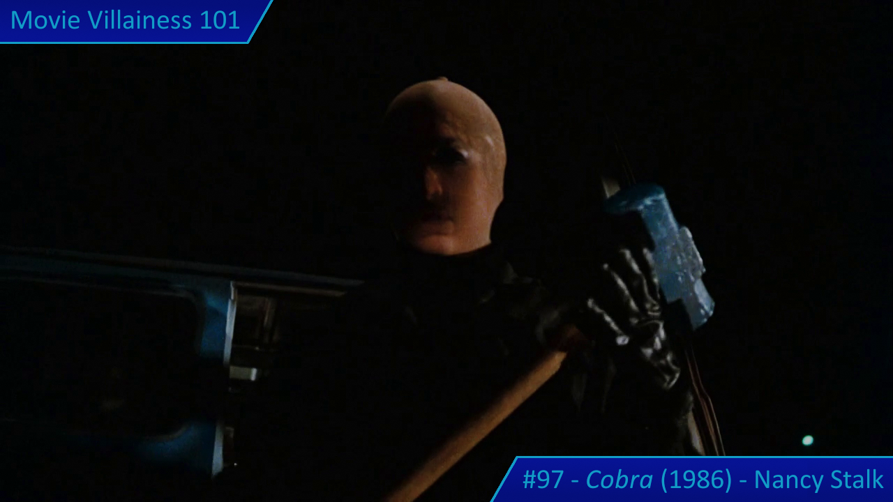 Cobra thinks there’s more than one killer. His boss thinks he’s off the mark. Guess who’s right, and we get two Night Slasher attacks in quick succession to validate the hero’s theory. Like many action movies, there’s a lone female in the stocking-masked gang, and that would be Nancy Stalk.