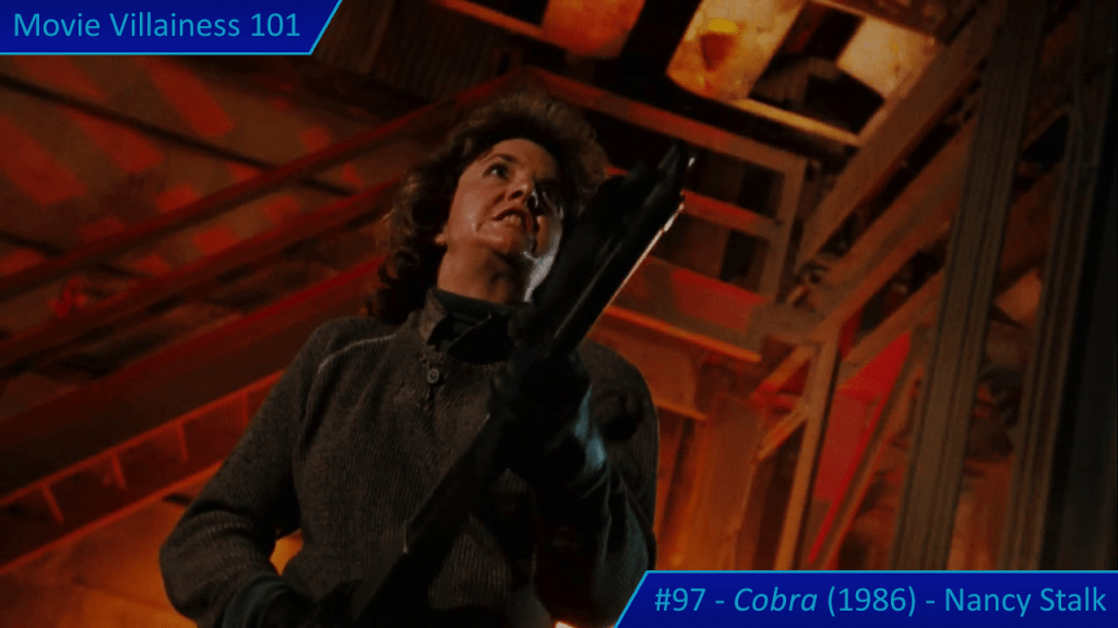 Nancy gets more action in the showdown, wielding a shotgun and chasing the terrified Ingrid through a steel mill. There’s the standard hero versus the remaining bad guys climax, but it’s obvious only the Night Slasher will put up a worthwhile fight in the inevitable last confrontation. At first, Nancy appears to get a rather lame death when Cobra shoots her in the back, but the villainess returns to disarm the hero (after a lengthy tough guy monologue!). Sadly, the resurrection is short-lived, and Nancy gets shot by the Night Slasher when Cobra uses her as a human shield.