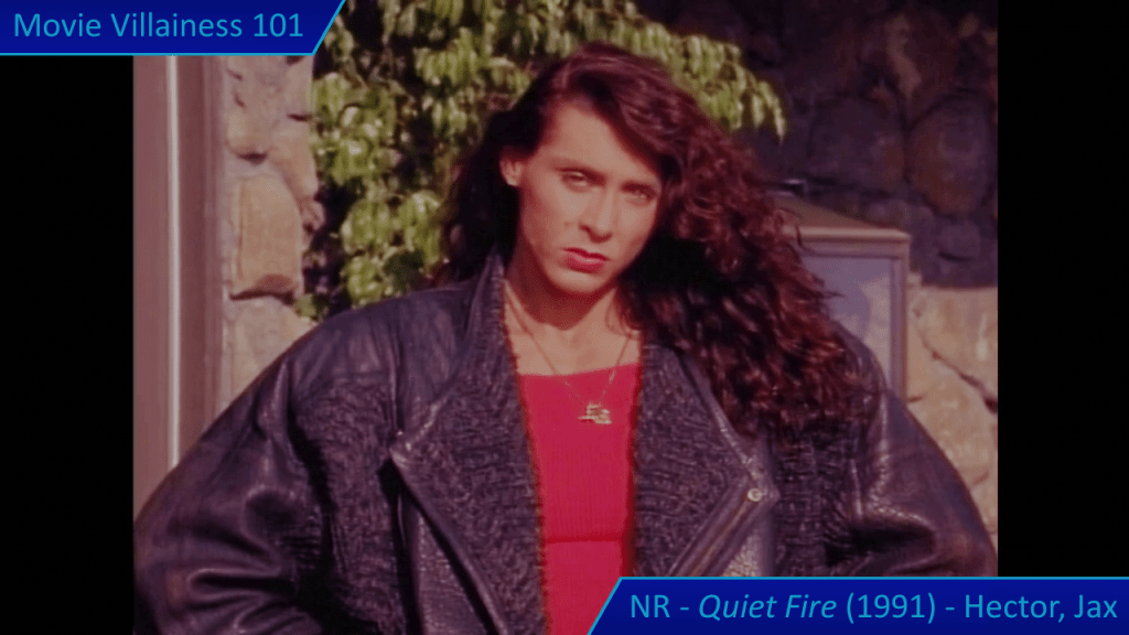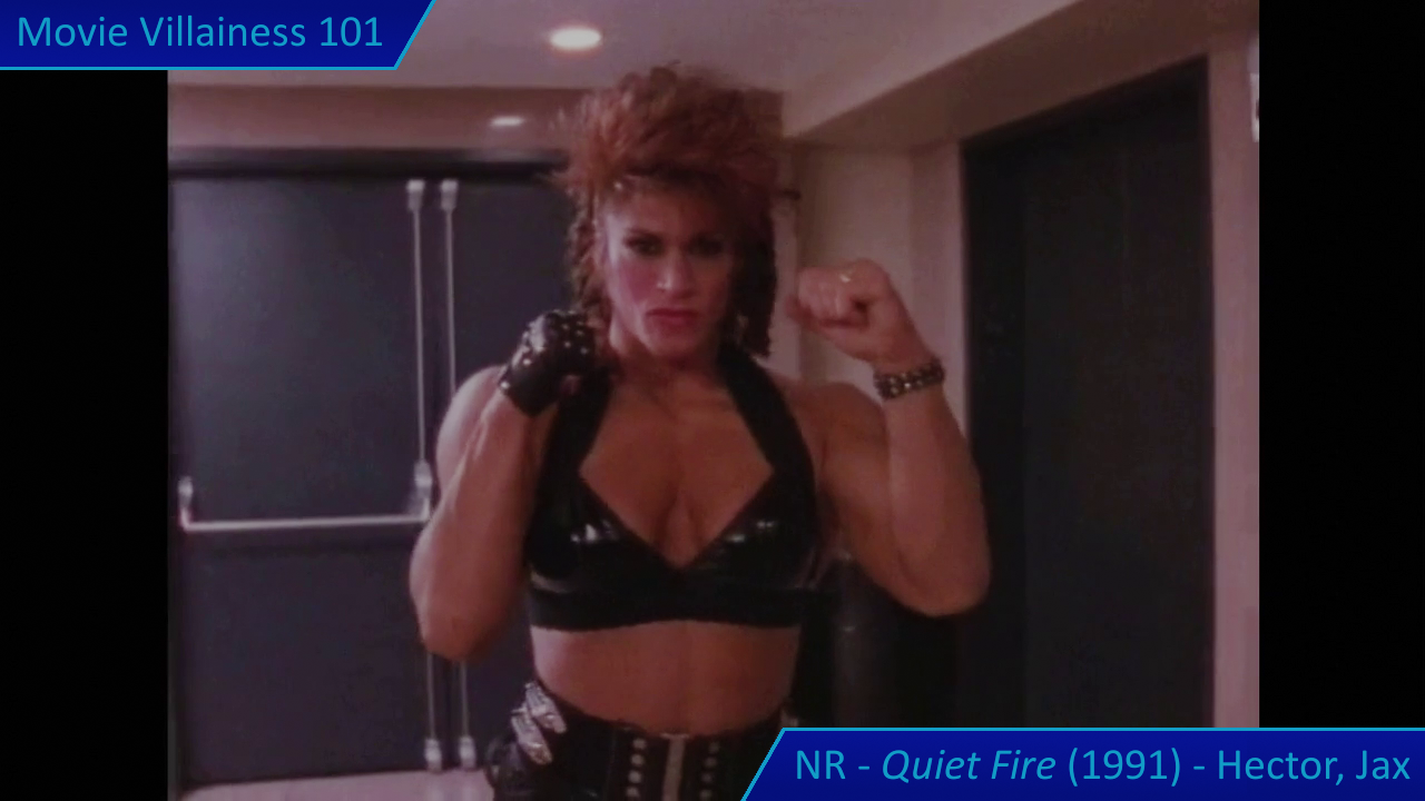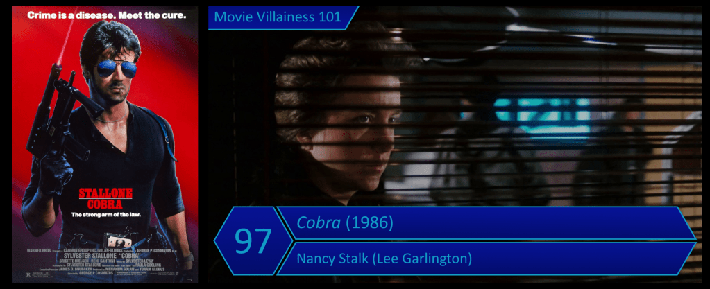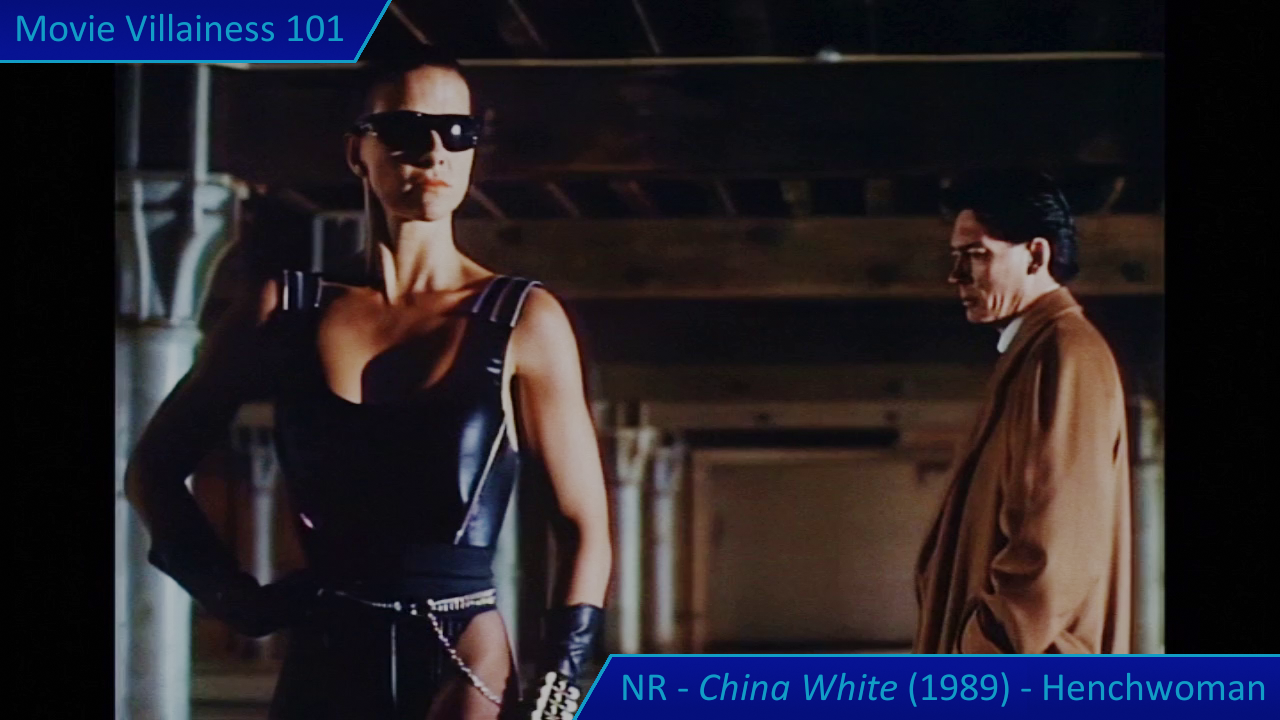 If I had to give an award for the best female villain entrance, it would go to the unnamed blonde brute in this rather generic 1980s action movie. As two guys are being interrogated by a ruthless crime boss (Billy Drago), a tall female in stiletto heels walks in, trampling broken glass underfoot. The camera then pans up to reveal a scary villainess wearing a short-sleeved leather top and sunglasses. She doesn’t need to say anything – it’s obvious what her role is.