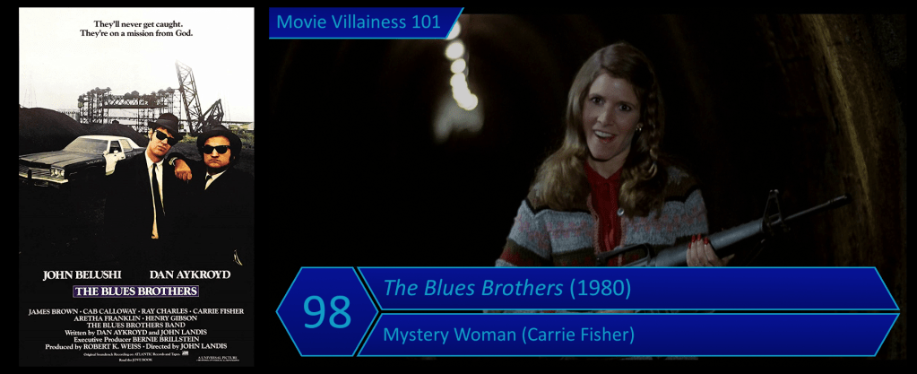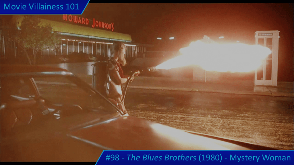 It’s not long before the brothers make enemies of the police. Bad news for Jake, only just released from prison. The list of vengeful foes grows after they steal a gig from a rival band and wreck a fascist group’s parade. By the end of the film, even the military has Jake and Elwood in its sights. Plenty of antagonists, but the Mystery Woman is the standout villain.