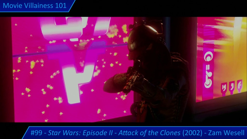 Instead, she foolishly goes after the master Jedi and gets cut down rather easily by his lightsaber. The villainess’ demise is okay, though nothing special. Just as she’s about to name her superior, a helmeted mercenary offs Zam with a toxic dart, and she reverts to her natural form. Before the Jedi can track the killer, he jetpacks off into the sky, setting up the main plot of the film.