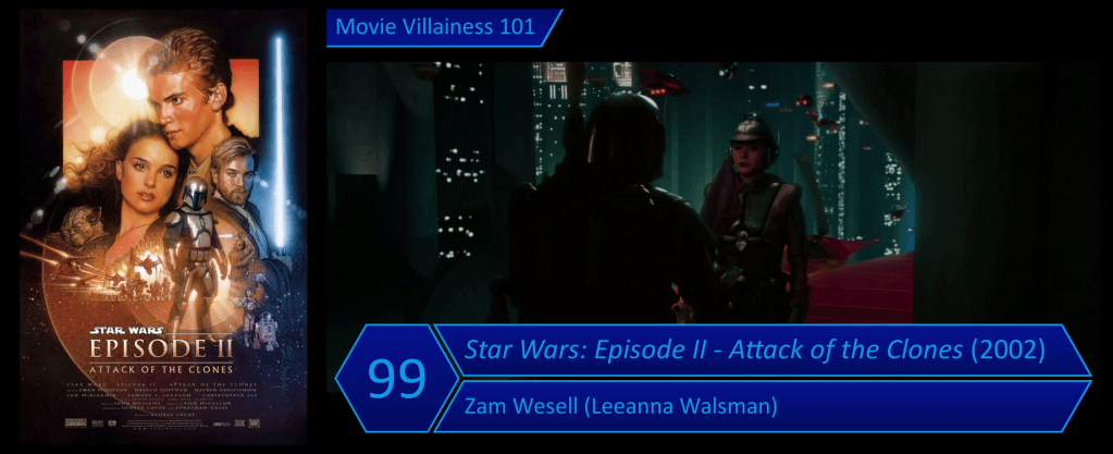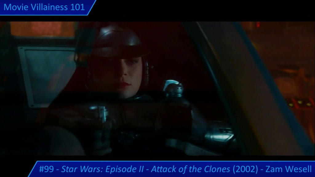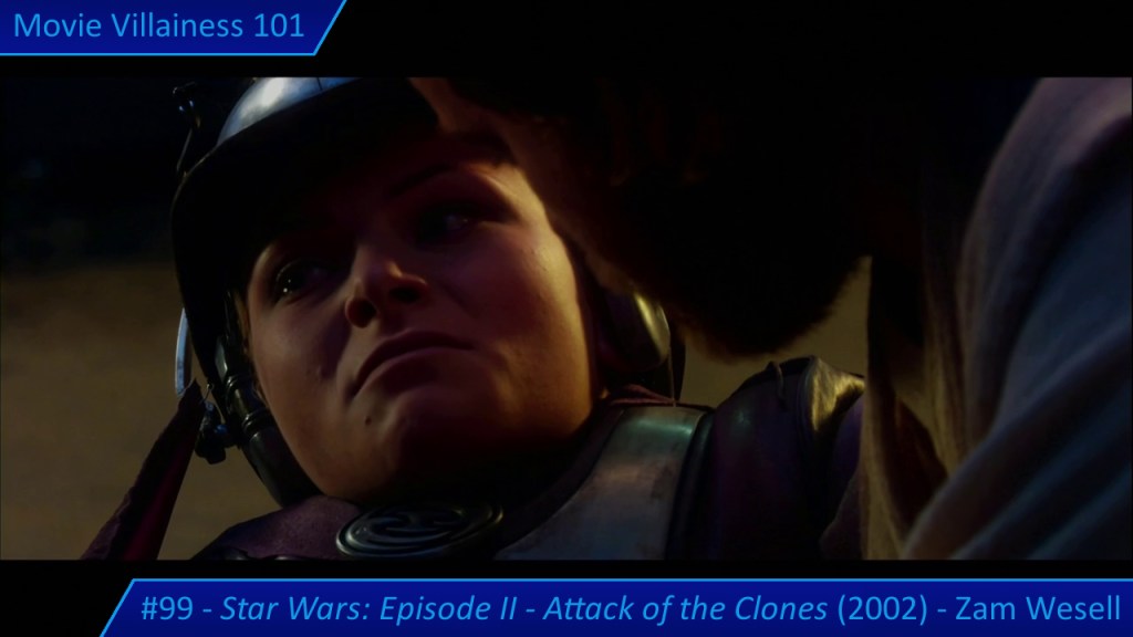 There’s not much competition for Star Wars villainesses, and Zam almost wins by default. That said, there are memorable scenes in Attack of the Clones, even though Zam is a minor character who only lasts the first quarter or so of the movie. Unfortunately, she’s then eliminated by an allegedly more important male villain.